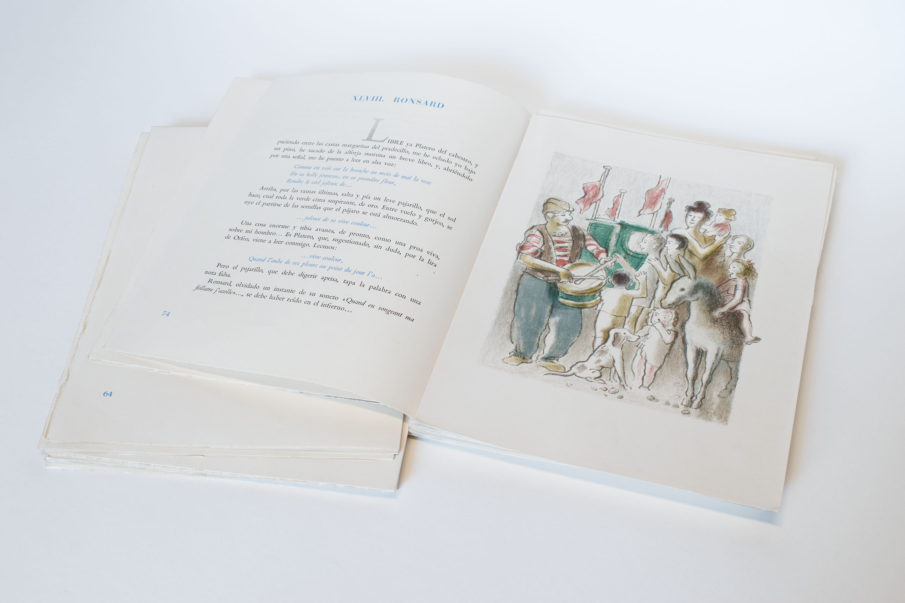 Se trata de una edición publicada en noviembre de 1947 por la editorial Gustavo Gili en Barcelona. Su singularidad como libro deriva de las litografías de Josep Mompou y Dencausse (1888-1968) que acompañan al texto. Mompou fue un notable pintor catalán perteneciente a la Generación del 17 cuya ascendencia francesa materna le llevó a vivir largas temporadas en París, donde comenzó a exponer de joven. El éxito progresivo de su obra le llevaría a prescindir del negocio familiar de fundición de campanas para dedicarse exclusivamente a la pintura. Su obra partió de los postulados estéticos del Modernismo y el Noucentismo para desembocar en la escuela fauvista y sus peculiares armonías del color, que él combina con una simplicidad muy elegante en el trazo del dibujo y una aparente espontaneidad que es fruto de una ejecución pacientemente meditada.