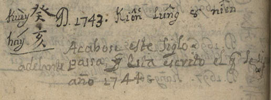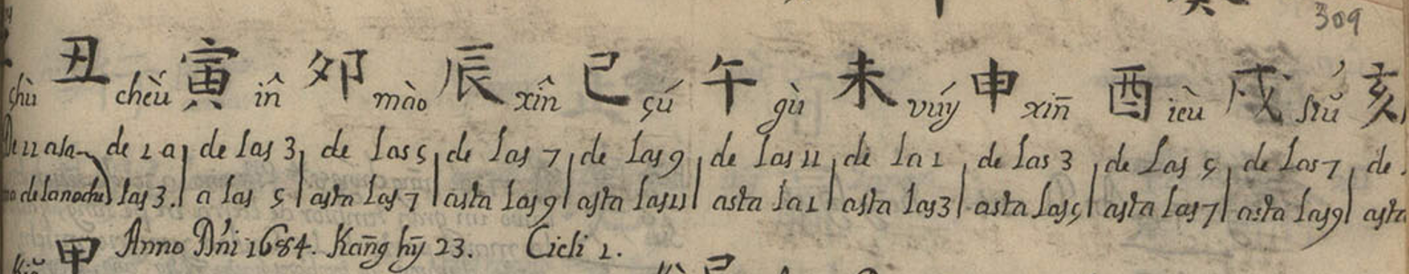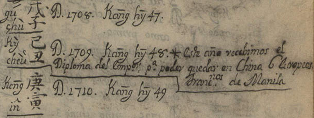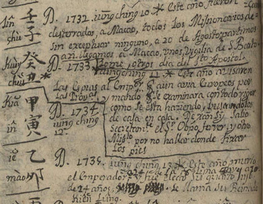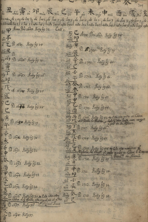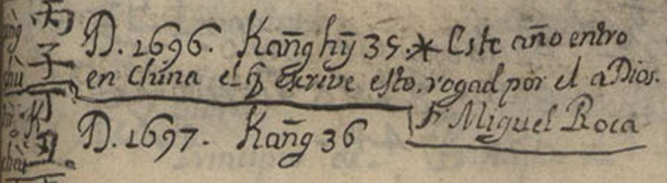 Gracias a las anotaciones manuscritas en la parte de la cronología (h. 310r-310v), el propio autor nos dice que llegó a China en 1696 y que estuvo allí al menos hasta 1744, aunque en la obra del Conde de Viñaza, citando el manuscrito de Miggenes, se indican algunas claves finales: