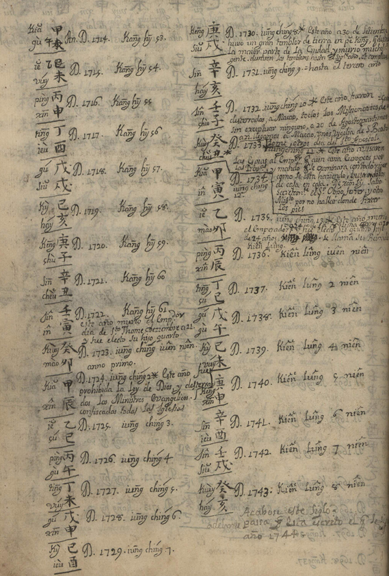 Gracias a las anotaciones manuscritas en la parte de la cronología (h. 310r-310v), el propio autor nos dice que llegó a China en 1696 y que estuvo allí al menos hasta 1744, aunque en la obra del Conde de Viñaza, citando el manuscrito de Miggenes, se indican algunas claves finales: