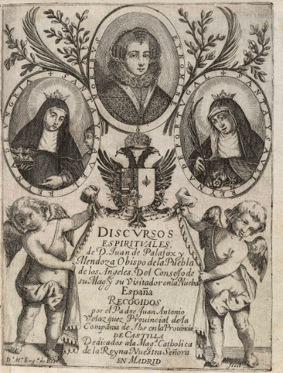 Hay que destacar otro frontispicio para los Discursos espirituales del obispo Juan de Palafox (1641) donde repite el concepto de retratos en parte superior en medallón en triduo iconográfico pues representa al centro a la reina Isabel de Borbón, y a cada lado a otras dos Isabeles referenciales, la reina Isabel de Hungría, santa, e Isabel de Portugal, la esposa del emperador Carlos. Las presenta entre ramas de olivo y palmas de triunfo sobre dos ángeles tenantes en un lienzo que muestra los datos editoriales.