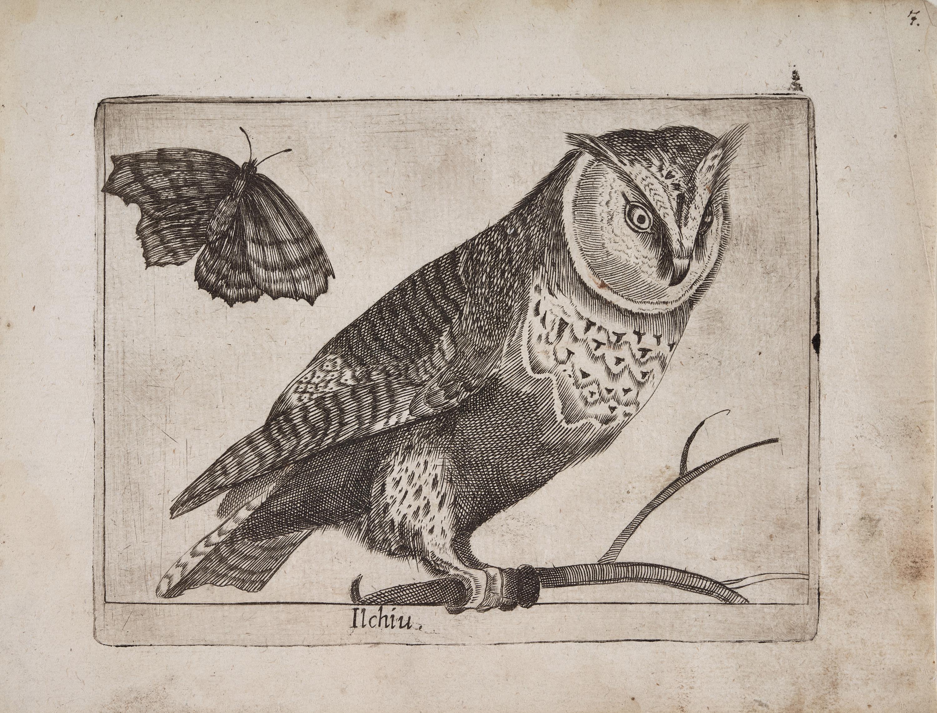 Esos años fueron los de construcción del Palacio del Buen Retiro y Olivares quiso que hubiera un gran jaulón de aves como símbolo de majestad, por lo que no es nada rara que una obra así fuera dedicada por la artista al príncipe Baltasar Carlos, siendo tan cortesana nuestra saga. Es un ejemplo además de naturalismo barroco pues si el Renacimiento fue el tiempo por excelencia de la anatomía humana, como ejemplifica escultóricamente el David, el Barroco mira iconográficamente a los animales como criaturas compañeros de viaje vital del hombre. Le influyeron a María Eugenia otras obras italianas grabadas sobre aves, y su curiosidad por reflejarlas con gran realismo es la estampa del Ilchiu, una rapaz española nocturna y por ello aparece a su lado una polilla… Más adelante volverá esta grabadora excelsa al mundo animal a través de los Excercicios de la gineta (1643) [RB, VII/2133].